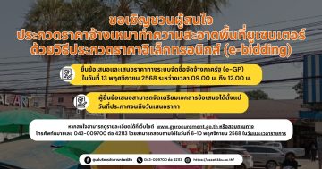 ประกวดราคาจ้างเหมาทำความสะอาดพื้นที่ยูเซนเตอร์ ด้วยวิธีประกวดราคาอิเล็กทรอนิกส์ (e-bidding) ผู้ที่สนใจต้องยื่นข้อเสนอและเสนอราคาทางระบบจัดซื้อจัดจ้างภาครัฐ (e-GP) ในวันที่ 13 พฤศจิกายน 2568 ระหว่างเวลา 09.00 น. ถึง 12.00 น. ผู้ยื่นข้อเสนอสามารถจัดเตรียมเอกสารข้อเสนอได้ตั้งแต่วันที่ประกาศจนถึงวันเสนอราคา ผู้สนใจสามารถดูรายละเอียดได้ที่เว็บไซต์ www.gprocurement.go.th หรือสอบถามทางโทรศัพท์หมายเลข 043-009700 ต่อ 42113 โดยสามารถสอบถามได้ในวันที่ 6-10 พฤศจิกายน 2568 ในวันและเวลาราชการ อ่านเอกสารเพิ่มเติม… อ่านTORเพิ่มเติม… อ่านประกาศเพิ่มเติม…